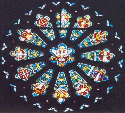 clockwise from L sgraffito, rose window and exterior of St Peter's.